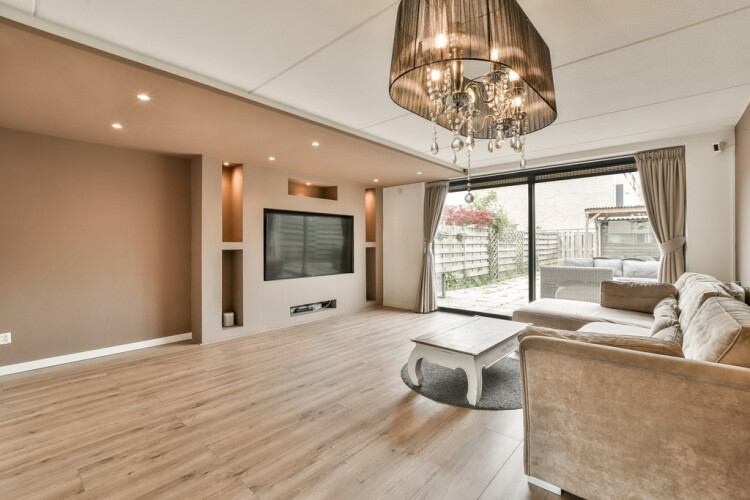 entrance, toilet, garden-oriented living room with sliding doors to the terrace, open kitchen with oven, induction hob, dishwasher and a large refrigerator. The ground floor has a quality wooden floor with underfloor heating.