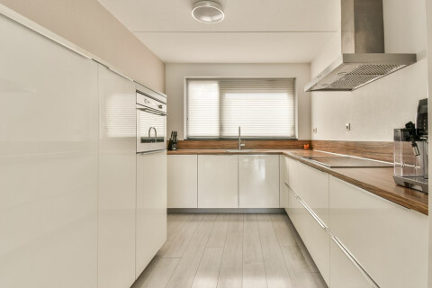 Via de voortuin bereikt men de entree met toegang tot de meterkast, toilet (zwevend closet), trap naar de eerste verdieping en de tuingerichte woonkamer. De moderne open keuken is aan de voorzijde geplaatst en voorzien van hoogglans witte fronten, RVS afzuigkap, keramische kookplaat, combi-oven, koel/vriescombinatie en vaatwasser.