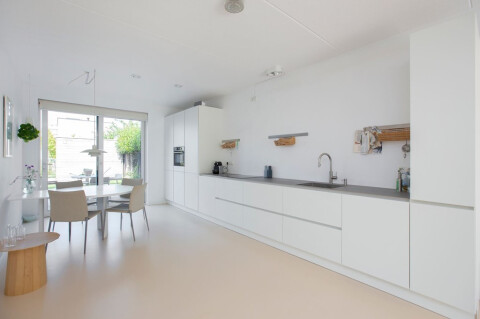 In de moderne open keuken is voldoende ruimte voor een eethoek, waar u lekker kunt tafelen. De keuken is voorzien van de benodigde apparatuur zoals een combi oven, vaatwasser, inductie kookplaat met afzuiger en quooker kraan. Het RVS aanrechtblad is warm gewalst en een echte eyecatcher; zo dun heeft u een aanrechtblad waarschijnlijk niet eerder gezien. Naast een apothekerskast vindt u hier voldoende bergruimte. Vanuit de keuken heeft u middels een aluminium schuifpui toegang tot de voortuin; ideaal als u bv. een bbq heeft. In de woonkamer is tevens een extra (berg)ruimte waar u provisie kunt opslaan.