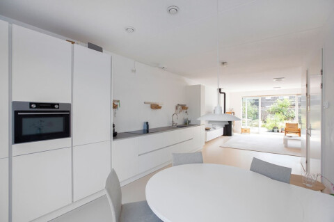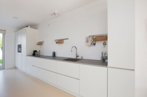 In de moderne open keuken is voldoende ruimte voor een eethoek, waar u lekker kunt tafelen. De keuken is voorzien van de benodigde apparatuur zoals een combi oven, vaatwasser, inductie kookplaat met afzuiger en quooker kraan. Het RVS aanrechtblad is warm gewalst en een echte eyecatcher; zo dun heeft u een aanrechtblad waarschijnlijk niet eerder gezien. Naast een apothekerskast vindt u hier voldoende bergruimte. Vanuit de keuken heeft u middels een aluminium schuifpui toegang tot de voortuin; ideaal als u bv. een bbq heeft. In de woonkamer is tevens een extra (berg)ruimte waar u provisie kunt opslaan.