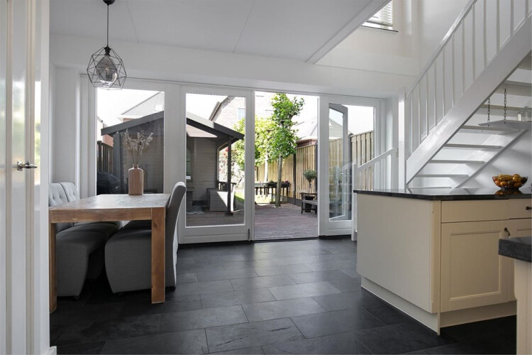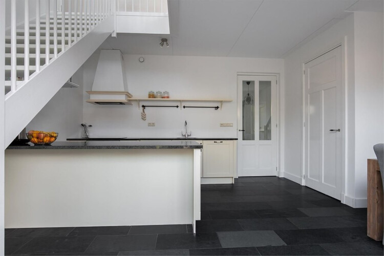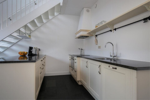 Hal met meterkast, toilet en kantoorruimte. De keuken is voorzien van diverse inbouwapparatuur. De hal en woonkeuken zijn voorzien van een natuurstenen vloer waarbij de keuken is voorzien van vloerverwarming.