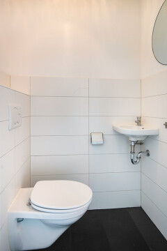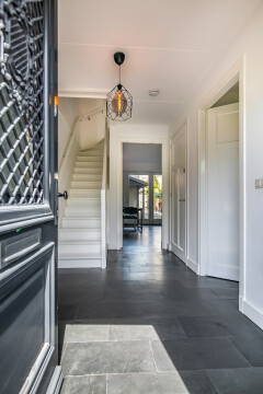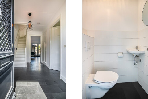 Hal met meterkast, toilet en kantoorruimte. De keuken is voorzien van diverse inbouwapparatuur. De hal en woonkeuken zijn voorzien van een natuurstenen vloer waarbij de keuken is voorzien van vloerverwarming.