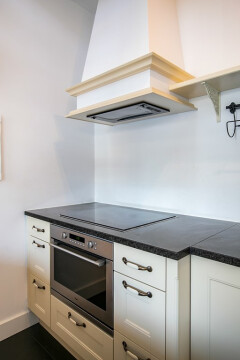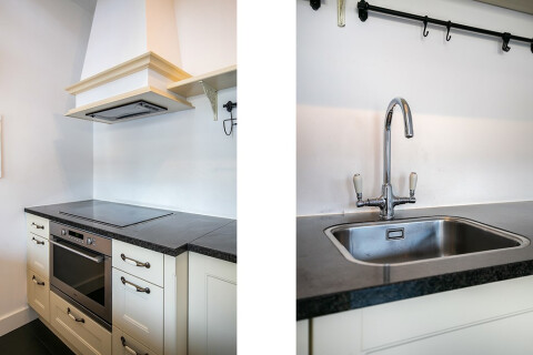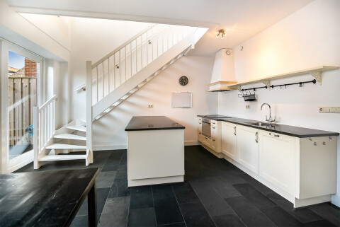 Hal met meterkast, toilet en kantoorruimte. De keuken is voorzien van diverse inbouwapparatuur. De hal en woonkeuken zijn voorzien van een natuurstenen vloer waarbij de keuken is voorzien van vloerverwarming.