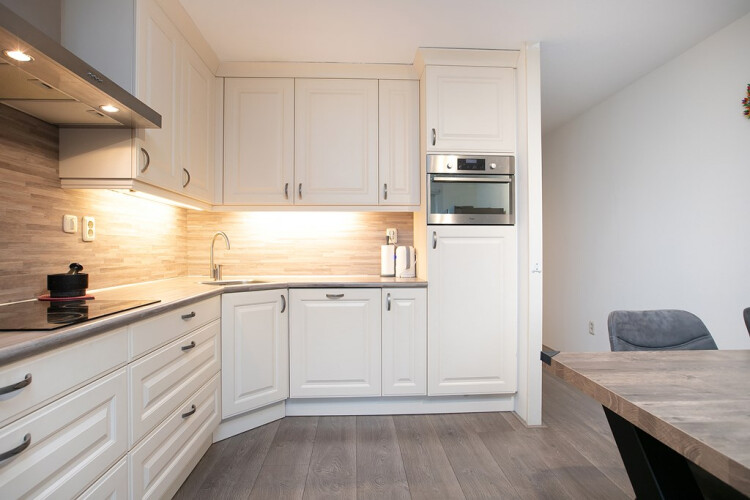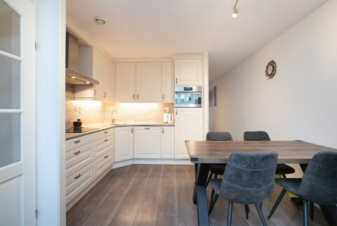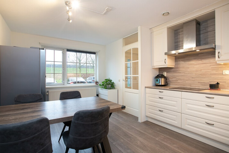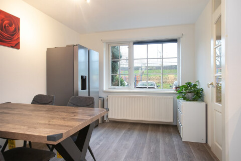 Ground floor layout: entrance, hall, meter cupboard (with district heating unit and fiber optic connection), cloakroom and modern toilet room with hand basin. Access to the garden-oriented and attractive living room with a house-wide sliding door and a wooden floor. The kitchen is located at the front of the house and has a fitted kitchen with various built-in appliances, including a dishwasher, oven, extractor hood and ceramic hob. Both the front and backyard have decorative paving and the sunny backyard offers a detached wooden shed with electricity.